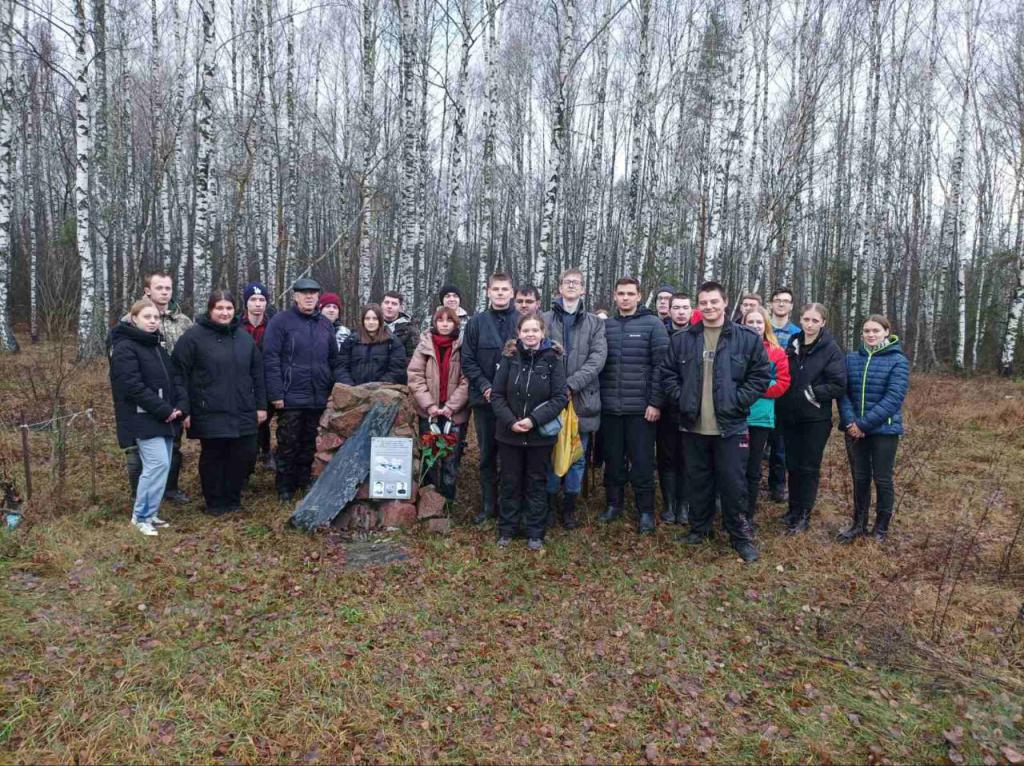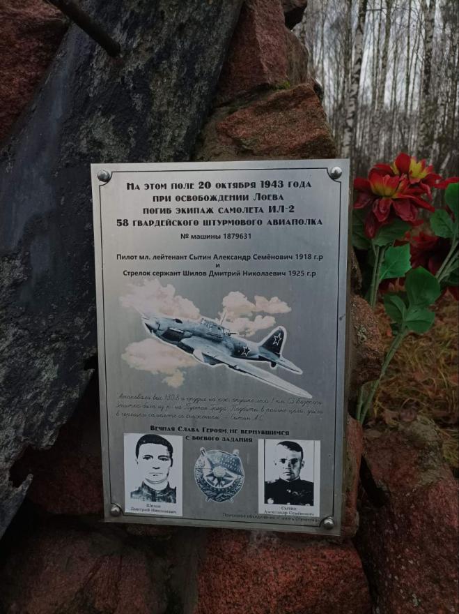 Студенты биологического факультета специальности "Лесное хозяйство" групп ЛХ-21 и ЛХ-31 под руководством доцентов кафедры Трухоновца В.В. и Колодия П.В. посетили мемориальный памятник лётчикам, погибшим 20 октября 1943 года при освобождении г. Лоева. В этот день погиб экипаж самолёта ИЛ-2 58 гвардейского штурмового полка в составе пилота, мл.лейтенанта Сытина Александра Семёновича и стрелка сержанта Шилова Дмитрия Николаевича. Они рисковали высоту 130.8 и орудием на южной опушке леса. Самолёт был сбит зенитным орудием врага.