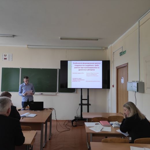 Доклад студентов кафедры лесохозяйственных дисциплин Тушинского Ф.Н., Берга А. М., Ксендикова А.В. «Особенности формирования урожая плодовых тел съедобного гриба шиитаке при культивировании на древесных субстратах, научный руководитель Трухоновец В.В., доцент кафедры лесохозяйственных дисциплин,к.с.-х.н., доцент.